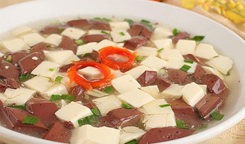 2、砂锅内放适量高汤,下入鸭血、豆腐、枸杞子炖煮,将熟时,放入菠菜,调味后再煮片刻,即成。