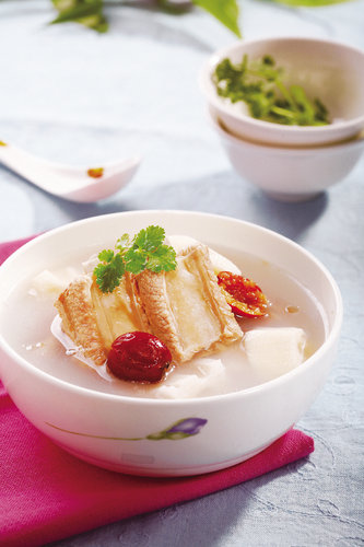 主料:藕 200g 枣(鲜) 100g 冬菇(干) 20g 饮用水 1000g 精盐 3g 鸡精 2g 香油 3g 香菜 2g