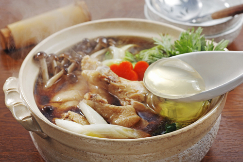 2、把母鸡去头脚,剁方块,放入炖盅内,加入姜片、葱结、绍酒、清汤。