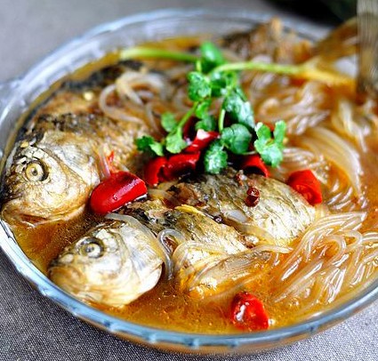 做法:1)鲫鱼宰杀去内脏,洗净后下锅用油煎制两面金黄,油可以多放些。2)盛出炸好的鲫鱼,放入切好的辣椒段、生姜,花椒炒香。3)倒入酱油。4)倒入清水,水可以多点,因为粉条比较吃水,倒入少许料酒、加入精盐。5)放入洗好的粉条,大火煮开。6)开锅后放入炸好的鲫鱼,改小火炖制20分钟。7)烹入少许陈醋后,再炖制5分钟即可,最后撒上香菜。