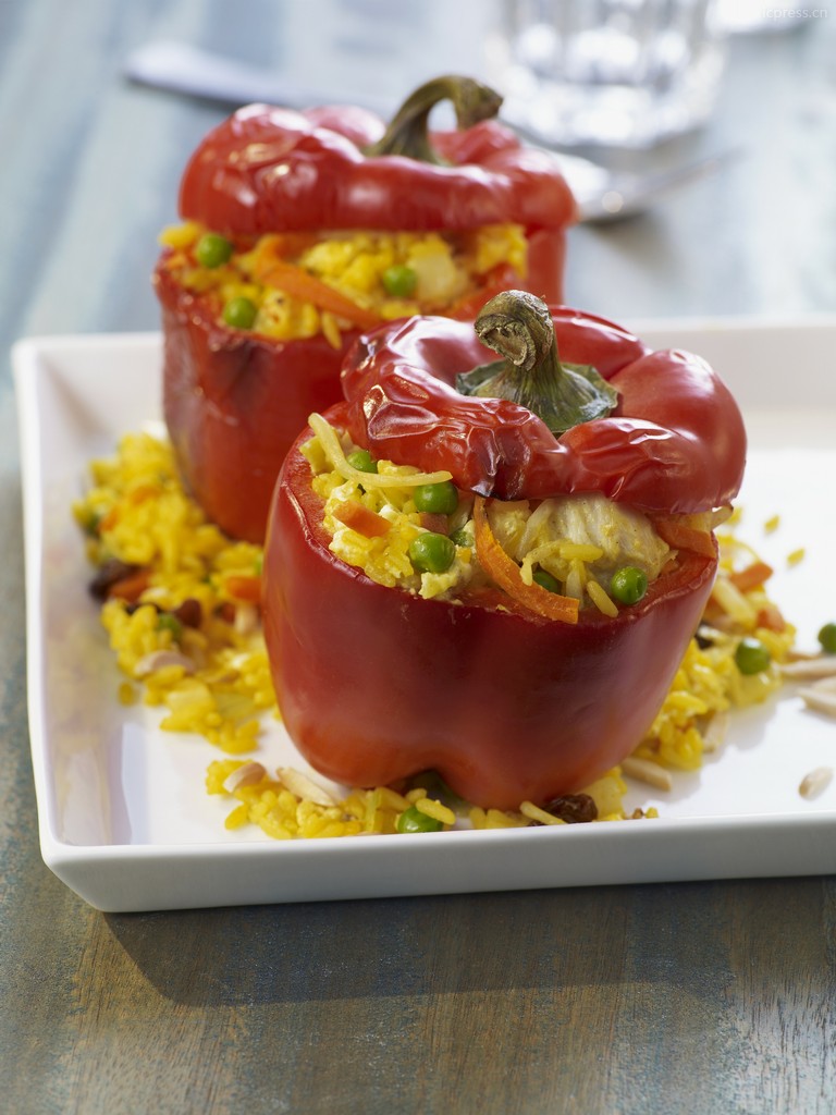 做法:干香菇泡软切细丁、绿蕃茄、洋葱火腿切小细丁。青椒、红椒对半去籽,一半切细丁另一半内部刮净备用。色拉油起油锅,将全部丁状材料入锅爆香,放入白饭及咖哩粉共拌。拌香之饭置于另一半青、红椒内,入烤箱以摄氏170度,烤25分钟。
