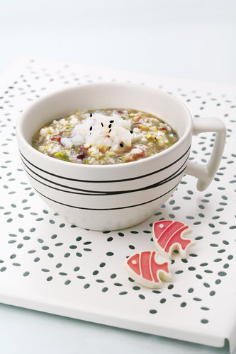2.将米洗净,连同煎汁一起放入沙锅内,加适量水,大火煮沸,改为小火煮约30分钟成粥,用糖调味即成。