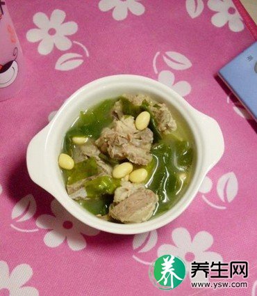 制法:先将黄豆用清水浸泡一夜,然后与昆布、海藻共煮汤,熟后加适量调味品即可。