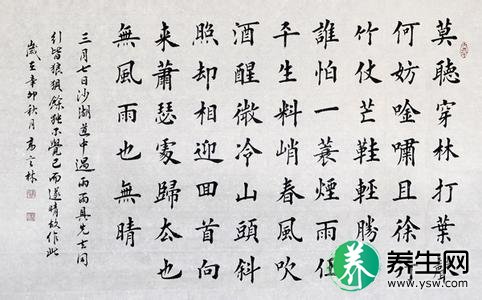 首句“莫听穿林打叶声”,一方面渲染出雨骤风狂,另一方面又以“莫听”二字点明外物不足萦怀之意。“何妨吟啸且徐行”,是前一句的延伸。在雨中照常舒徐行步,呼应小序“同行皆狼狈,余独不觉”,又引出下文“谁怕”即不怕来。徐行而又吟啸,是加倍写;“何妨”二字透出一点俏皮,更增加挑战色彩。