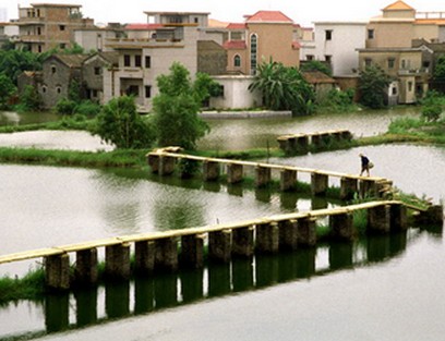沿着弯弯的乡间小路,可来到古劳水乡一处名叫“二渡桥”的地方。只见前面的围墩上,有几棵百年老榕,静静地镇守和护卫着这一方水土。榕荫下,几块长条花岗岩石条曲曲折折地架在鱼塘边的木桩上,颇有一种“小桥流水人家”的韵味。这种花岗岩石条,当地人称它“条石”或“西樵石”。因水乡的泥土细滑,不易渗水,偶尔几滴小雨,这里便遍地泥泞,行走不便。于是居民们便用这种“条石”沿着小河涌和糖基铺路,形成了遍布水乡的石板小桥和石板小路,构成一幅独特的风景。