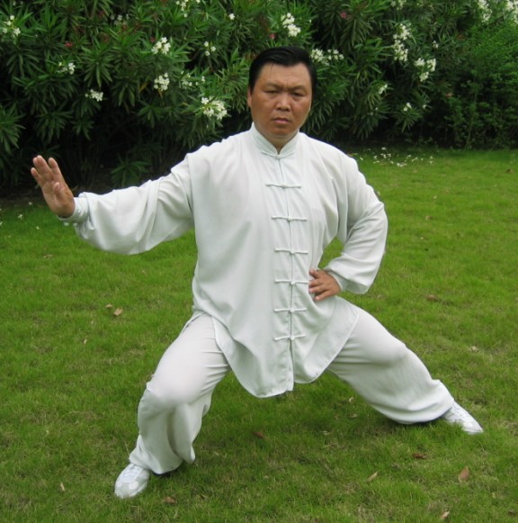 (2)迈步时须缓缓将重心移向一侧,其胯根内收,使腹部充实重心坐稳,然后缓缓提起另一侧腿,(必须由大腿蓄劲于膝,带动小腿,提脚跟,足跟自然下垂),慢慢迈出足尖由下垂变为上翘,足跟落地要轻点(迈步如猫行),然后过渡到足掌足尖,后身体有意识向下沉劲,重心稍压前腿,随后再重心后移做下面的动作。动作要点是速度不能有快有慢,无论下落和上翘,必须要有阻力感,不可随意,这样才能做到运动如抽丝,才符合如履薄冰的要求。
