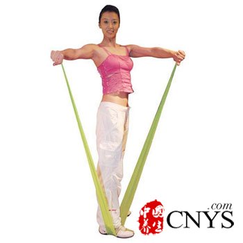 5.接着双臂向左右两边打开,拉伸弹力绳,双臂打开的幅度不用过大,只要感受到上臂肌肉的拉伸即可;