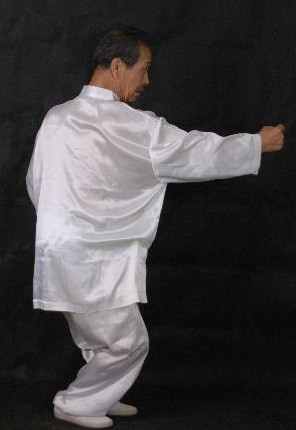 3、对方以右直拳攻击我的头面或胸部,当其右拳接近我时,我迅速抬左脚向对方右外侧进步,右脚紧跟,闪过对方右拳,此时对方右肋部位已暴露无遗,我顺势以右手崩拳攻击对方右肋部位。