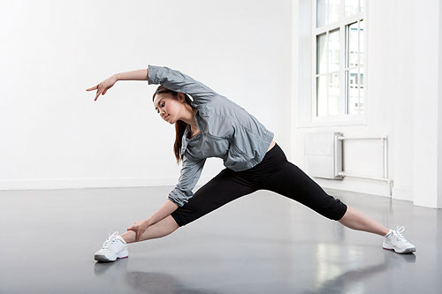 5、左脚保持不动,让右脚慢慢地放在身体后面,让双脚与地板保持平行,这个状态维持3秒钟左右。