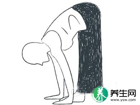 步骤1、两腿并拢,上身向下弯曲,两手掌尽量触地放在脚掌两侧。 养生网小编提示:如果手掌不能触地,双腿可稍微分开一点。