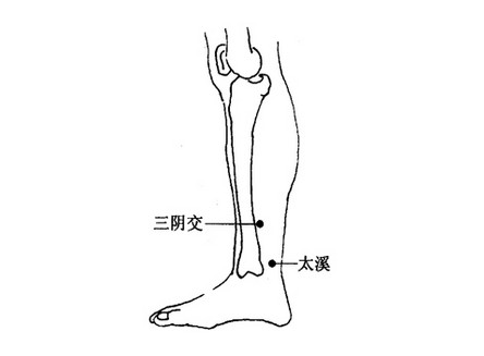 三阴交:在内踝尖直上3寸,胫骨后缘。