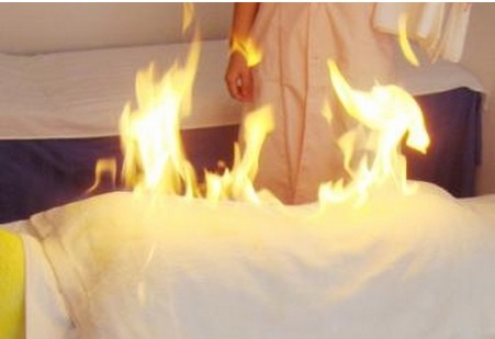 2、闪火法:火在罐内壁烧1-2圈后,迅速退出,然后将罐罩在患处,此法比较安全,不受体位限制。