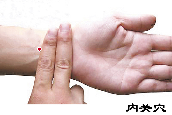 内关为“足厥阴心包经”要穴,位于腕横纹上2寸,掌长肌腱与桡侧腕屈肌腱之间,主治心悸、高血压、癫痫、哮喘、胃痛、恶心、呕吐等。