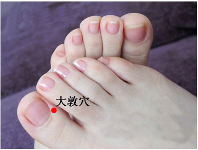 在脚大拇趾趾甲靠第二趾一侧2毫米处为大敦穴。按摩大敦穴一般采用指压法:指压时强压7~8秒钟,才慢慢呼气,冬季起床容易赖床的女性朋友不妨在暖暖的被窝里重复按上几次。