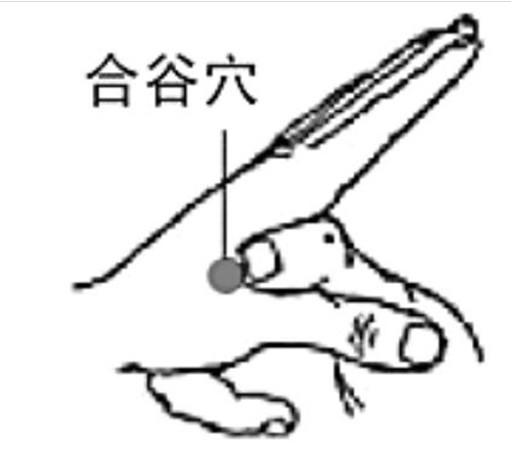 取穴方法:拇、食指张开,使虎口拉紧,另一手的拇指关节横纹压在虎口上,拇指关节前弯曲,拇指尖所指凹陷处即是穴位。