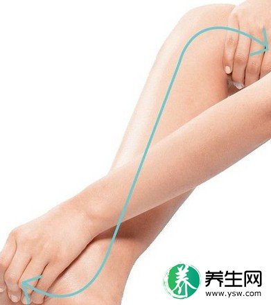 8、以同样的方式按摩小腿外侧,在小腿肚的地方,左右拇指施力按压,打通经络,粉碎废物与毒素,然后按摩至大腿根。