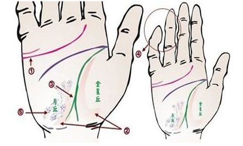 风湿病:掌肌滑溜溜的,多有风湿病。手指关节肿而痛。感情线起点处成双,多有痛风。金星丘、月丘的隆起肌肉很瘦薄,筋力不足。生命线末端分叉成两股, 末端扩散,表示风湿晚期行走有问题。尾指、无名指不能自由屈伸,老是弯曲,是风湿性神经麻痹。手腕周围到月丘下,出现暗紫黑斑,通常是风湿症腰部障碍,脚踝内侧也会呈现类似色调。