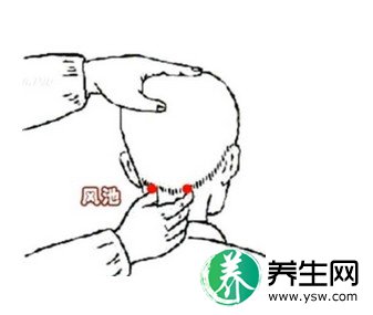 按揉风池穴(当项部枕骨之下,胸锁乳突肌与斜方肌上端之间凹陷处),将两手拇指指腹分别按于同侧风池穴,其余四指附于头部两侧,由轻至重按揉1分钟。