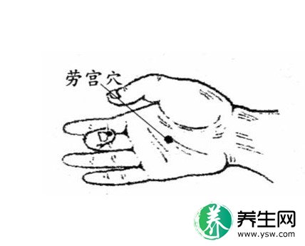 劳宫穴:劳宫穴(握拳中指尖所指处即是)为手厥阴心包经之荥穴,在五行中属火,能够促进血液循环、改善精神紧张、促进食欲。
