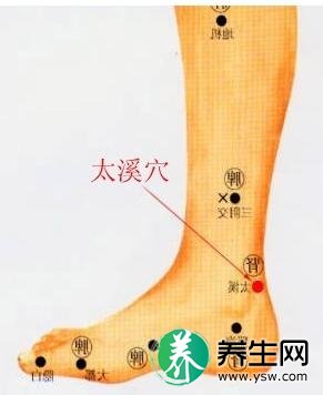 太溪穴位于足内侧,内踝后方与脚跟骨筋腱之间的凹陷处。也就是说在脚的内踝与跟腱之间的凹陷处。双测对称,也就是两个。这个养生要穴是肾的原穴,是储存肾脏元气的仓库。肝属木,肾属水,树木需要水的浇灌才能健康成长,所以养肝必须要滋阴。用太溪调动肾脏的功能,能够更好地“滋水涵木”。