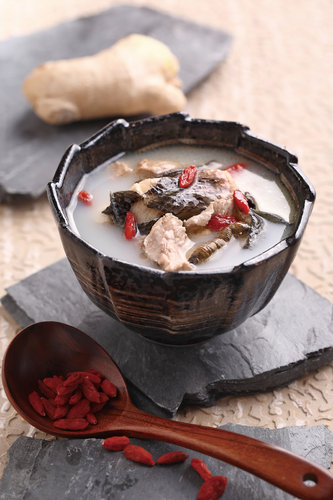 材料:泽泻、车前子各6克,茯苓、薏仁各9克,红枣5粒,冬瓜1块,鸡胸肉100克,香菇丁半杯,干贝3粒,胡萝卜丁半杯,竹笋丁半杯,盐1茶匙,生姜2片,米酒半匙。