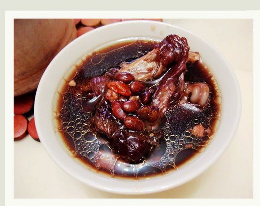 鸡1只750克,黑豆、黑枣、百合各50克,姜片3克,葱花5克,酱油30克,味糖、食盐适量。鲜鸡洗净,在冷水中煮开捞出,再洗净,将黑豆、黑枣、百合置鸡肚内,加人酱油、葱、姜至炖熟后,取出姜片,加入味精、食盐即可。本晶适用于阴虚烦渴、咽干、盗汗、腰腿痛伴形体消瘦、手足掌心灼热患者。