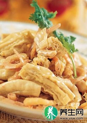 ②油烧热后爆香蒜茸、姜末、加入腐竹及虾皮(连汁),煮沸调味、再用小火烩20分钟,淋上麻油即成。可经常食用,本品为高蛋白饮食,防止低血糖和高脂血症。