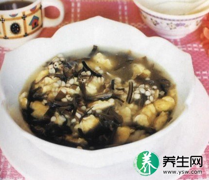 做法:将海带洗净后切成条状,薏苡仁洗净后与海带同放入锅中煮至熟烂。油锅中将打匀的鸡蛋炒熟,将熟烂的海带和薏苡仁倒入其中翻炒,根据个人口味放入调味品后继续翻炒均匀即可食用。