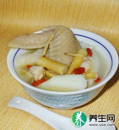 枸杞鸡肉汤:鸡半只,枸杞子15克,淮山30克,生姜片15克,精盐适量。将鸡肉洗净切块,倒入开水锅中烫一下取出,以去除腥味,然后把鸡块放入砂锅中,加入淮山药、枸杞子、生姜片及适量开水,用小火煮至肉烂汤香,调入盐,再煮一沸即成。当主餐,随意食用。有补肝益肾,温中益气的功效。